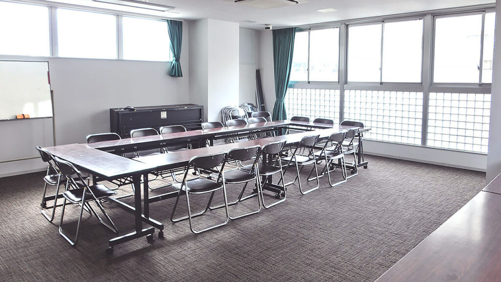 3人用長机 16台、椅子 50脚、ホワイトボード 1台 (小学校の普通教室程度の大きさです。)